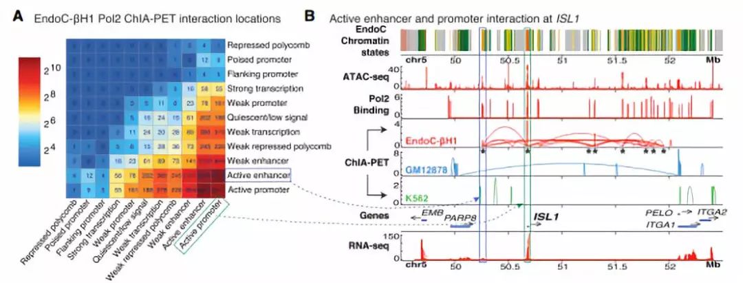 為示意功能性順式調(diào)控網(wǎng)絡(luò),文中在EndoC-bH1中采用RNA聚合酶(Pol2)ChIA-PET,鑒定了25,336個(gè)推定的Pol2介導(dǎo)的染色質(zhì)互作。進(jìn)一步過濾,與ATAC-seq OCRs取交集,得到16,756個(gè)互作,大多數(shù)與活性增強(qiáng)子和啟動(dòng)子關(guān)聯(lián)。且與已在人胰島中報(bào)道過的互作一致,包括 ISL1和PDX1位點(diǎn)。