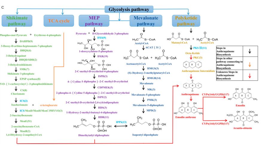 圖1.決明子內(nèi)參與橙黃決明素生物合成潛在代謝通路