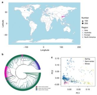 甘藍型油菜(Brassica napus,2n=4x=38,AACC)是一種重要的異源多倍體作物,其來自于白菜型油菜(Brassica rapa,2n=2x=20,AA)和甘藍(Brassica oleracea,2n=2x=18,CC)的種間雜交。然而,真正的野生B. napus群體尚不清楚,其起源和改良過程仍不清楚。在本研究中,研究人員利用重測序的方法對588份甘藍型油菜(Brassica napus)進行測序,揭示了A亞基因組可能從歐洲蕪菁的祖先進化而來,而C亞基因組可能是從大頭菜,花椰菜,西蘭花和中國羽衣甘藍的共同祖先進化而來。此外,冬季油籽型可能是歐洲油菜的原始形式。防御反應相關(guān)基因在亞基因組上的特異性選擇有助于物種形成后的環(huán)境適應性,而不對稱的亞基因組選擇導致生態(tài)型的變化。通過結(jié)合全基因組關(guān)聯(lián)分析(genome-wide association studies),群體選擇分析及轉(zhuǎn)錄組分析,研究人員鑒定了與提高的脅迫耐受性,含油量,種子質(zhì)量和生態(tài)型改良相關(guān)的基因,這些基因成為甘藍型油菜(Brassica napus)進一步功能鑒定和遺傳改良的候選基因組。