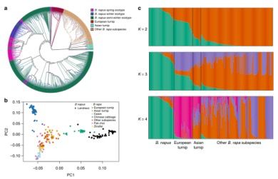 作為較早的異源多倍體作物之一,B.napus通過B. rapaB.oleracea雜交形成,估計甘藍型油菜(B.napus)的形成時間為~6700和~7500年前及38000-51000年前。文獻中記載,冬季甘藍型油菜首次在歐洲種植,大約在1700年,春季甘藍型油菜開始種植并在18世紀末傳播到英國,半冬生態(tài)型主要在中國種植,在1930 – 1940年間從歐洲引入。然而,并沒有真正已知的野生甘藍型油菜(B.napus)群體,導致雜交形成B.napus的兩個祖先種的√確身份仍然難以捉摸,因為B. rapaB. oleracea具有形態(tài)多樣的亞種,并且通常在整個歐洲種植了幾百年。這些物種之間的天然雜交偶然性地在適當?shù)臈l件下發(fā)生。雖然最近的一項研究表明甘藍型油菜(B.napus)的A亞基因組可能來源于歐洲蕪菁(B. rapa ssp. rapa)的祖先,但是由于僅5份B.napus和27份?B. rapa種質(zhì)被納入該項分析中,因此需要提供更多支持該結(jié)論的證據(jù)。先前基于細胞核和葉綠體標記的研究也表明,甘藍型油菜可能是從蘿卜和西蘭花之間的種間雜交發(fā)育而來,或是由幾個獨立的雜交事件形成的。為了進一步了解甘藍型油菜的進化,有必要揭示野生種或馴化種的供體是否是親本祖先,其中B. rapaB. oleracea亞種參與甘藍型油菜的形成。
