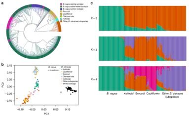 基于*佳模型(Bna, BraA和BolC SNPs集合分別采用GTR+F+ASC+R5, GTR+F+ASC+R7?和?TVM+F+ASC+R8模型),利用IQ-TREE構(gòu)建(ML) trees(圖1a,2a,3a),結(jié)果顯示,B. napusB. rapaB. oleracea各自具有一個分枝。大部分甘藍型油菜(B.napus)依據(jù)生態(tài)型聚類到一起,而B. rapaB. oleracea的聚類主要反映了亞種間的關(guān)系。BraA的系統(tǒng)發(fā)育關(guān)系顯示,甘藍型油菜(B.napus)的親緣關(guān)系更接近于European turnip(歐洲蕪菁),并與B. rapa?ssp.?rapa?(亞洲蕪菁)及其它亞種親緣關(guān)系較遠(圖2a),而這正與最近的一項研究結(jié)果相一致,即甘藍型油菜(B. napus)的A亞基因組是從歐洲蕪菁的祖先進化而來的;通過動態(tài)演化情境模擬進一步分析顯示,在大約~106-1,170年前,從歐洲蕪菁到甘藍型油菜A亞基因組發(fā)生了基因交流(fastsimcoal2);PCA主成分分析顯示,甘藍型油菜地方品種(B. napus?landraces,n = 50,1980年前登記)更接近歐洲蕪菁(n = 33)(圖2b)。群體結(jié)構(gòu)分析顯示,當K=2時,為佳的分群數(shù)(圖2c),其明確的將甘藍型油菜的地方品種與歐洲蕪菁分開,進一步支持了甘藍型油菜A亞基因組的進化歷史。