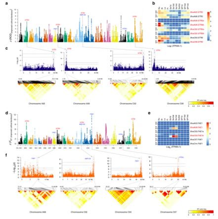 為了鑒定與11個農(nóng)藝性狀相關(guān)的候選基因,研究人員利用了多位點隨機混合線性模型mrMLM v1.3進行全基因組關(guān)聯(lián)分析研究(genome-wide association studies)。為了獲得高質(zhì)量的SNPs,研究人員對Bna SNP集合進行了估算,保留了670,028個SNP,MAF> 5%,用于后續(xù)的GWAS分析。通過19個樣品多態(tài)性核苷酸和Sanger測序結(jié)果的評估比較,表明98.74%的推算基因型是正確的,20份種質(zhì)的兩個生物學重復推算的與真實的基因型的平均系數(shù)(r2)為0.956,最小值和最大值范圍從0.928到0.967,進一步證實推算的基因型的z確性。最終共計鑒定了與10個目標性狀顯著相關(guān)的60個位點,其中5個與種子產(chǎn)量相關(guān),3個與長角果長度相關(guān),4個與油脂含量相關(guān),48個與種子質(zhì)量相關(guān)(圖4c),此外,3個位點在閾值范圍內(nèi)顯示與開花時間相關(guān),與種子質(zhì)量性狀顯著相關(guān)的SNPs解釋了14.30%?到35.47%的表型變異,高于種子產(chǎn)量(16.81%)和含油量(20.64%),此外,本研究中還檢測到與先前的GWAS研究中與種子質(zhì)量相關(guān)的大部分基因座。由于與油含量和產(chǎn)量的相關(guān)性狀是復雜的并容易受到環(huán)境變化影響,研究人員將本研究中重要的基因座位與前期研究的QTLs位點進行了整合。因此,在受選擇區(qū)與QTLs定位區(qū)域內(nèi),基于功能注釋和轉(zhuǎn)錄組分析控制不同性狀的候選基因被鑒定,如下分析。