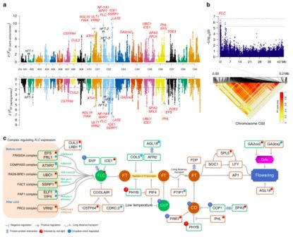 研究人員在FLOR-ID(FLOweRing Interactive Database)中檢索到了306個基因與擬南芥開花時間相關(guān),在甘藍型油菜中鑒定了1,225個直系同源基因。在兩組比對中,24?個開花時間相關(guān)基因同時坐落在受選擇區(qū)域中(圖5a,c),其中22個分布在C亞基因組上,主要通過春化和光周期途徑調(diào)節(jié)開花時間。特別地,FLC基因座及其染色質(zhì)介導的調(diào)節(jié)原件將是調(diào)控甘藍型油菜開花時間的*有希望的靶標。
