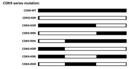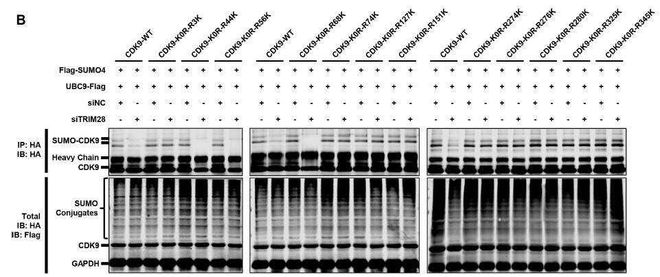 接下來(lái)作者試圖鑒定應(yīng)該在CDK9?賴氨酸殘基上發(fā)生的SUMO化位點(diǎn)。賴氨酸突變實(shí)驗(yàn)結(jié)果:CDK9-K0R突變體含有所有賴氨酸變?yōu)榫彼岬耐蛔?,完全中止了CDK9被SUMO化的能力;其他CDK9突變體仍然能夠通過(guò)TRIM28進(jìn)行SUMO化,這表明在整個(gè)CDK9序列中可能存在多個(gè)SUMOylation位點(diǎn)。采用基于CDK9-K0R全突變體的逆轉(zhuǎn)突變策略,發(fā)現(xiàn)CDK9上的幾個(gè)賴氨酸顯著SUMO化。其中,多個(gè)SUMO化位點(diǎn)與CDK9 C-末端自身磷酸化位點(diǎn)相鄰,據(jù)報(bào)道這些位點(diǎn)是Tat-P-TEFb與TAR RNA高親和力結(jié)合所必需的,即?SUMO化可以通過(guò)阻止相鄰的磷酸化來(lái)降低結(jié)合能力。