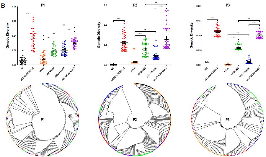 之后作者試圖確定TRIM28的敲低是否在接受抑制性cART療法至少6個(gè)月的HIV-1感染者的靜息CD4+T細(xì)胞中重新激活潛伏的HIV-1。基于細(xì)胞內(nèi)HIV-1 RNA的定量,表明用αCD3/αCD28刺激顯著誘導(dǎo)HIV-1的表達(dá)。TRIM28敲低重新激活了與HDAC抑制劑SAHA相似量的HIV-1 RNA表達(dá)。在將TRIM28敲低與SAHA組合后,重新激活效果更顯著。同樣,SUMO4敲低和SAHA添加的組合使用可以重新激活比單獨(dú)使用更多的HIV-1 RNA表達(dá)。雖然TRIM28單獨(dú)缺失重新激活相似數(shù)量的具有SAHA的遺傳多樣化HIV-1表達(dá),但TRIM28敲低和SAHA的組合重新激活了更多遺傳多樣化的HIV-1表達(dá)。