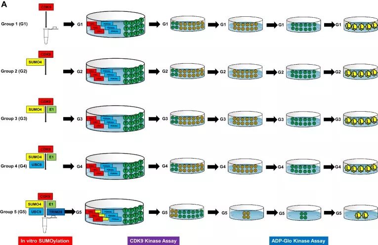 Co-IP實(shí)驗(yàn)發(fā)現(xiàn)細(xì)胞周期蛋白Cyclin T1僅與野生型CDK9結(jié)合形成正性轉(zhuǎn)錄延伸因子P-TEFb復(fù)合物,而不是SUMO化的CDK9。為了研究TRIM28介導(dǎo)的CDK9 SUMO化是否影響CDK9的激酶活性,進(jìn)行了體外CDK9 SUMO化測(cè)定和CDK9激酶活性測(cè)定:發(fā)現(xiàn)當(dāng)TRIM28 SUMO化CDK9時(shí),CDK9的激酶活性顯著降低。不添加TRIM28,CDK9的激酶活性不受影響,盡管已添加其他SUMO化組分。