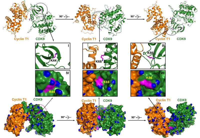 為了進(jìn)一步確定哪些位點(diǎn)確實(shí)僅被TRIM28 SUMO化,作者敲除了內(nèi)源性TRIM28并測(cè)試了上述鑒定候選位點(diǎn)的SUMO化潛力,發(fā)現(xiàn)Lys44、Lys56和Lys68的SUMO 化信號(hào)在缺乏內(nèi)源性TRIM28時(shí)完全消失,進(jìn)一步支持這些位點(diǎn)被TRIM28特異性SUMO化。直接分析富集的SUMO-CDK9的靶特異性SUMO-MS也證實(shí)了該結(jié)果。Lys44的乙酰化是其激酶活性所必需的,其他2個(gè)SUMO化位點(diǎn)Lys56和Lys68在CDK9和細(xì)胞周期蛋白T1的相互作用區(qū)域內(nèi)。SUMO蛋白是多肽大分子,它的存在可以形成空間位阻,從而阻止P-TEFb復(fù)合物的形成。