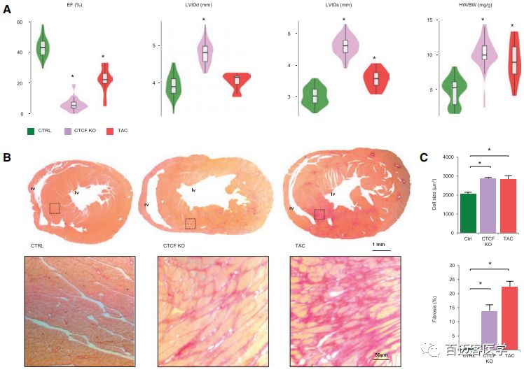 對(duì)CTCF-KO小鼠的表型呈現(xiàn)明顯的心肌病,失去CTCF會(huì)導(dǎo)致射血分?jǐn)?shù)受損、左心室擴(kuò)張以及器官和細(xì)胞水平的肌肉肥厚。而TAC小鼠也表現(xiàn)出肥厚,并伴有較輕微的心室大小和射血分?jǐn)?shù)的變化,這表明CTCF-KO和TAC小鼠代表了不同的病理生理模型。