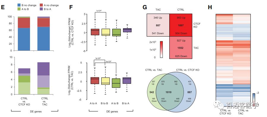 CTCF的缺失或TAC對(duì)染色體的A compartment和B?compartment的影響較小,而其中發(fā)生compartment轉(zhuǎn)換的區(qū)域與基因表達(dá)呈正相關(guān),即從A?compartment到B?compartment轉(zhuǎn)換區(qū)域的基因表達(dá)下調(diào),從B?compartment到A?compartment轉(zhuǎn)換區(qū)域的基因表達(dá)上調(diào)。CTCF-KO、TAC小鼠間存在41%的共有差異表達(dá)基因,兩者都表現(xiàn)出已知的標(biāo)志基因激活。ChIP-seq檢測(cè)到CTCF靶向基因的轉(zhuǎn)錄起始位點(diǎn),而這些基因富集在與心臟病相關(guān)的通路中。