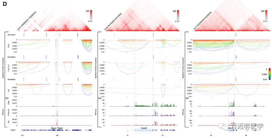 存在互作的9194個(gè)表達(dá)基因中,60%的基因在CTCF-KO和TAC中的互作變化方向相同。而剩余的40%基因中大多數(shù)(75%)是在某一組疾病細(xì)胞中虎作沒有發(fā)生變化的,25%是互作變化在兩組中相反的。在CTCF-KO和TAC中互作改變相同且差異表達(dá)的3651個(gè)基因中,絕大多數(shù)(86%)的局部互作減少(圖4B)。這些發(fā)現(xiàn)支持了這樣一種趨勢(shì),即更多的動(dòng)態(tài)染色質(zhì)互作影響基因表達(dá),兩組疾病細(xì)胞與對(duì)照相比,它們的基因表達(dá)變化方向更可能趨向一致?;プ鲾?shù)量top 40的差異表達(dá)基因在疾病細(xì)胞中的互作持續(xù)下降,如與鈣依賴信號(hào)和心肌肥厚相關(guān)的基因Ppp3ca。