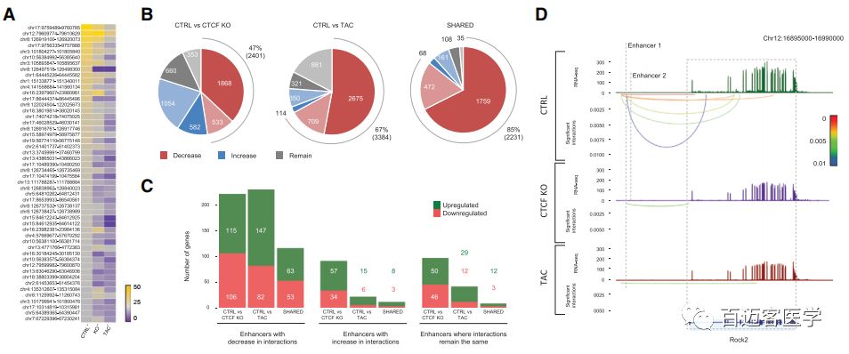 在先前鑒定的成人心肌細(xì)胞增強(qiáng)子中,其中有115050個(gè)再本研究中存在互作。這些增強(qiáng)子的互作在疾病細(xì)胞中減少。事實(shí)上,其中47%在CTCF-KO中表現(xiàn)出了互作減少,67%在TAC中表現(xiàn)出互作減少。兩種疾病細(xì)胞中共有的增強(qiáng)子中,85%在兩者中均出現(xiàn)互作減少。且兩種疾病細(xì)胞中基因表達(dá)變化與其增強(qiáng)子-基因互作的減弱有關(guān),且受影響的基因在心臟病理通路中富集,如Rock2