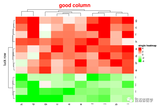 column_title?=?“good?column”,column_title_side?=?“top”,column_title_gp?=?gpar(fontsize?=?20,?fontface?=?“bold”,col=”red”),column_title_rot?=?0,cluster_columns?=?T,clustering_distance_columns?=”euclidean”,clustering_method_columns?=?“complete”,column_dend_side?=”top”,column_dend_height?=?unit(10,?“mm”),show_column_dend?=TRUE,column_dend_gp?=?gpar(),row_title?=?“luck?row”)由此,我們可以很方便地更改圖上的熱圖主體和熱圖組件的屬性。