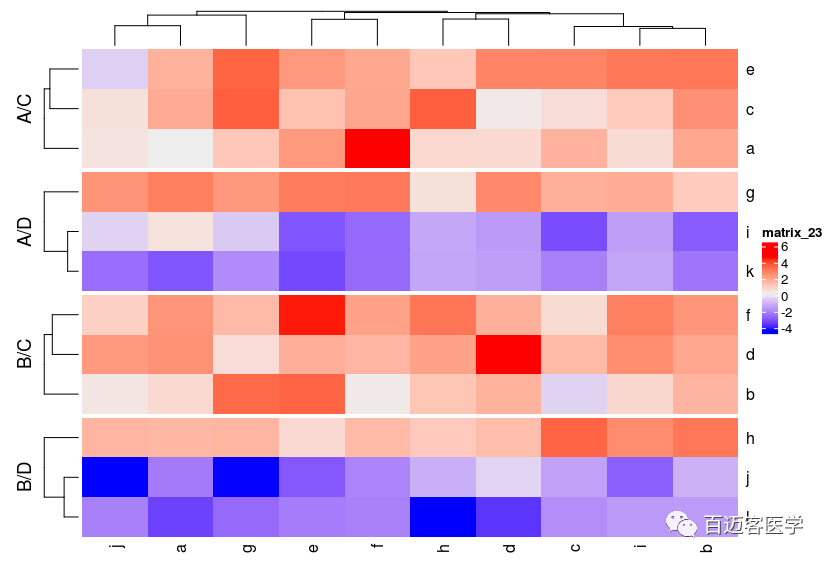 Heatmap(mat,?split?=?data.frame(rep(c(“A”,?“B”),?6),?rep(c(“C”,?“D”),?each?=?6)))