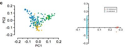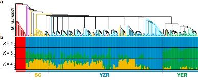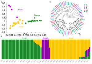共計(jì)選擇了243份二倍體棉花材料:230份亞洲棉G. arboreum?(A2)?和13份草棉G. herbaceum?(A1),來(lái)自于中國(guó)南部(SC),長(zhǎng)江(YZR)和黃河(YER)。以雷蒙德氏棉(G. raimondii)為外群,構(gòu)建系統(tǒng)發(fā)育樹顯示,G. herbaceum(草棉)和G. arboretum(亞洲棉)聚類成2個(gè)獨(dú)立的群(見(jiàn)圖2a和b)。G. arboretum(亞洲棉)進(jìn)一步又分為SC,YZR和YER三個(gè)群,顯示了地理分布模式的差異,進(jìn)而利用PCA分析支持這一結(jié)果(見(jiàn)圖2c)。