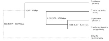 利用OrthoMCL軟件檢測(cè)WR04-6、R498、Nipponbare和W1943(O. rufipogon)間核心的、非必須的和共有的基因家族。在WR04-6中鑒定到了909個(gè)擴(kuò)張的基因家族,并且通過(guò)通路分析顯示,這些基因在光合作用和呼吸作用中顯著富集(p<0.01),例如氧化磷酸化、光合作用和核糖體的KEGG途徑,考慮其可以作為遺傳改良的信號(hào)。以O. barthii作為外群構(gòu)建的進(jìn)化樹顯示W(wǎng)R04-6與粳稻祖先的分化時(shí)間估計(jì)在3,706ya(1,235ya-6,326ya),見(jiàn)圖4。