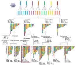 在構(gòu)樹基因組中共發(fā)現(xiàn)15,254個(gè)基因家族,與桑樹分化之后,有431個(gè)基因家族擴(kuò)張,230個(gè)基因家族收縮,表明在適應(yīng)進(jìn)化過(guò)程中,構(gòu)樹中更多的基因家族經(jīng)歷了擴(kuò)張而不是收縮。另外,與苜蓿、毛楊和甜橙相比,轉(zhuǎn)錄因子發(fā)生明顯收縮(58個(gè)家族共1,342個(gè)轉(zhuǎn)錄因子,占蛋白編碼基因的4.4%)。肌動(dòng)蛋白在植物的生長(zhǎng)和發(fā)育的很多層面扮演著重要的角色,在酵母和很多動(dòng)物中,肌動(dòng)蛋白僅被一個(gè)單基因編碼。在構(gòu)樹中僅發(fā)現(xiàn)4個(gè)肌動(dòng)蛋白,少于藻類、小立碗蘚和無(wú)油樟。