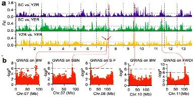 人工選擇在農(nóng)作物的馴化和遷徙的過(guò)程中具有重要的作用。群體結(jié)構(gòu)分析顯示當(dāng)K=4時(shí),YER與SC和YZR明顯不同(圖2b,K=4)。通過(guò)兩兩群體間的選擇性清除分析(FST)鑒定出了分別覆蓋到59,53和51個(gè)顯著遺傳分化的區(qū)域。SC和YZR之間的21個(gè)分化的區(qū)域(約43.5 Mb?含有915個(gè)基因)在群體SC和YER之間是保守的(圖3a)。對(duì)來(lái)自不同環(huán)境下的11個(gè)重要性狀進(jìn)行全基因組關(guān)聯(lián)分析,在98個(gè)顯著關(guān)聯(lián)的信號(hào)中,其中25信號(hào)個(gè)來(lái)自基因區(qū)(外顯子或內(nèi)含子區(qū)),包含與形態(tài)性狀相關(guān)的8個(gè)信號(hào)區(qū),與產(chǎn)量性狀相關(guān)的6個(gè)信號(hào)區(qū),與油籽性狀相關(guān)的3個(gè)信號(hào)區(qū);剩余73個(gè)信號(hào)來(lái)自非編碼區(qū)。大部分農(nóng)藝性狀的GWAS關(guān)聯(lián)信號(hào)中顯示地理差異,如分支數(shù),開花期,鈴重和抗病性這些性狀定位在保守的基因區(qū)(圖4b)。
