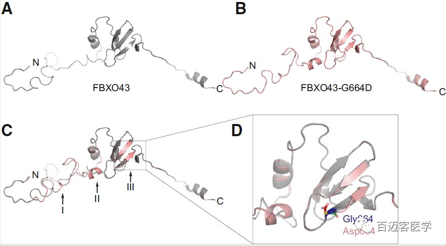 FBXO43(c.1991C>T)非同義突變導(dǎo)致FBXO43蛋白664殘基從非極性氨基酸(Gly甘氨酸)轉(zhuǎn)變?yōu)閹ж?fù)電荷的氨基酸(Asp天冬氨酸)(G664D)。蛋白質(zhì)二級(jí)結(jié)構(gòu)通過(guò)in silico結(jié)構(gòu)模型預(yù)測(cè),與野生型相比,具有2個(gè)明顯縮短的β-折疊(殘基654-668)、額外產(chǎn)生的α-螺旋(殘基610-613)和明顯變化的loop(殘基583-618)。