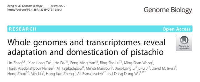 2019年04月18日,Genome Biology在線發(fā)表了中國(guó)科學(xué)院昆明動(dòng)物研究所與北京百邁客生物科技有限公司共同合作文章“Whole genomes and transcriptomes reveal adaptation and domestication of pistachio” 中國(guó)科學(xué)院昆明動(dòng)物研究所研究員吳東東為本文通訊作者,中國(guó)科學(xué)院昆明動(dòng)物研究所曾琳,北京百邁客公司大項(xiàng)目負(fù)責(zé)人韓鳳鳴,戴鶴為共同第一作者。本文繪制了開(kāi)心果的基因組草圖,并對(duì)其進(jìn)行了大規(guī)模的基因組重測(cè)序并進(jìn)行了比較基因組分析,表明,開(kāi)心果的應(yīng)激適應(yīng)可能與細(xì)胞色素P450和幾丁質(zhì)酶基因家族的擴(kuò)增有關(guān)。尤其重要的是,比較轉(zhuǎn)錄組學(xué)分析表明茉莉酸(JA)生物合成途徑在開(kāi)心果耐鹽性中起著重要作用。此外,研究人員對(duì)93個(gè)栽培種和14個(gè)野生種(P. vera)基因組及35個(gè)親緣關(guān)系密切的野生黃連木屬基因組進(jìn)行了重測(cè)序,以提供對(duì)種群結(jié)構(gòu)、遺傳多樣性和馴化的見(jiàn)解與思路。