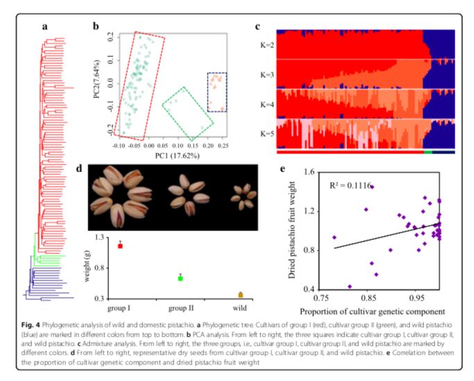 基于重測(cè)序數(shù)據(jù),研究人員推測(cè)了這些物種的有效群體大小的變化,并發(fā)現(xiàn)在 Pleistocene期間發(fā)生了瓶頸事件,且在 ~200 kyr前,有效群體大小增加。系統(tǒng)發(fā)育樹(shù)顯示馴化和野生開(kāi)心果之間的分離(圖4a)。利用δaδi推算野生和馴化開(kāi)心果的分化時(shí)間在 ~8000年前,這與早在公元前6750年就表明開(kāi)心果種子是一種常見(jiàn)的食物這一考古記錄相似。為了深入了解開(kāi)心果種質(zhì)之間的遺傳關(guān)系,研究人員進(jìn)行了兩項(xiàng)經(jīng)典分析:群體結(jié)構(gòu)和主成分分析(圖4b,c)。這些分析清晰的顯示栽培種質(zhì)分為兩個(gè)群。栽培種Group I的LD最高,栽培種Group II和野生開(kāi)心果的LD衰減值相近。Group II包括 Qazvini,Italiaei和Badami