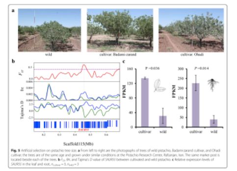 群體核苷酸多態(tài)性θπ分析揭示了馴化型種質(zhì)的核苷酸多態(tài)性低于野生型種質(zhì),通過(guò)分析發(fā)現(xiàn),栽培種質(zhì)中基因組上的一些區(qū)域的多態(tài)性降低,這些區(qū)域可能含有受到人工選擇的基因。此外,研究人員鑒定了栽培型和野生型樣品分化水平增加的區(qū)域。在馴化和野生的開(kāi)心果之間,在基因組上約有9.2 Mb的區(qū)域被鑒定為具有高水平的群體分化。栽培種間遺傳多樣性降低,且超過(guò)95%的閾值。遺傳多樣性減少的區(qū)域和群體分化增強(qiáng)的區(qū)域在馴化或育種過(guò)程中經(jīng)歷了選擇性清除。共計(jì)有665個(gè)基因定位在該區(qū)域。研究人員定位了受正向選擇的候選基因,其可能與馴化過(guò)程中重要的表型進(jìn)化相關(guān)。在開(kāi)心果馴化的過(guò)程中,其樹(shù)形大小經(jīng)歷了人工選擇(圖5a)。研究人員發(fā)現(xiàn)了基因SAUR55(圖5b),編碼生長(zhǎng)素應(yīng)激蛋白,在植物的生長(zhǎng)過(guò)程中發(fā)揮重要的作用,其在開(kāi)心果的人工選擇下進(jìn)化而來(lái)。除此之外,基于也和根的轉(zhuǎn)錄組數(shù)據(jù)分析結(jié)果顯示,馴化種與野生種相比,基因SAUR55表現(xiàn)出了顯著增加的表達(dá)水平(圖5c)。這些結(jié)果與在其它作物(如水稻和小麥)中生長(zhǎng)素應(yīng)激性基因的選擇性清除的研究結(jié)果一致,并揭示了在作物馴化期間類似特征性狀的人工選擇。果實(shí)重量是作物馴化和育種期間最重要的特征之一,包括開(kāi)心果。在栽培種中,品種成分與果實(shí)重量呈正相關(guān)(圖4e)。這支持了一個(gè)結(jié)論,在開(kāi)心果中,果實(shí)重量的人工選擇發(fā)生在馴化與人工選擇期間。研究人員指出,基因CYCD7-1在人工選擇的進(jìn)化下,野生種和馴化的栽培種之間具有高度的群體分化特征。該基因編碼D型細(xì)胞周期蛋白,控制細(xì)胞分裂及種子發(fā)育過(guò)程中的生長(zhǎng)率。CYCD7-1基因的過(guò)表達(dá)包括在胚胎和胚乳中的細(xì)胞增殖和細(xì)胞增大,其在擬南芥中導(dǎo)致種子過(guò)度生長(zhǎng)?;?em>CYCD7-1在花粉和早期發(fā)育中顯示特殊表達(dá),但在葉和根中沒(méi)有表達(dá)。因此,有希望在未來(lái)的實(shí)驗(yàn)中比較野生型和馴化型開(kāi)心果在花粉和早起發(fā)育時(shí)期CYCD7-1基因的表達(dá),研究人員提出在CYCD7-1基因上進(jìn)行的人工選擇可能會(huì)改變開(kāi)心果的重量。