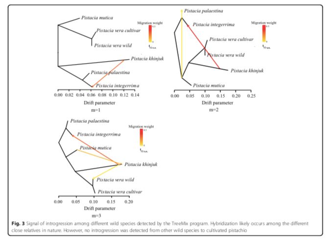 為了研究開(kāi)心果的種群歷史和適應(yīng)性進(jìn)化,研究者對(duì)107個(gè)開(kāi)心果基因組進(jìn)行重測(cè)序,包括93個(gè)品種和14個(gè)野生開(kāi)心果,平均測(cè)序深度為6-8X。作者還重新測(cè)序了來(lái)自不同近緣種的35個(gè)基因組,包括P.mutica,P.khinjuk,P.integerrimaP. palaestina。用stringent GATK pipeline,發(fā)現(xiàn)14.77百萬(wàn)個(gè)單基因變異位點(diǎn),其中2.42百萬(wàn)個(gè)在基因區(qū)。使用鄰近法和最大似然法的系統(tǒng)發(fā)育分析清楚地分離了5種不同的種群,即?P.vera, P.mutica, P. khinjuk, P. integerrima, and P. palaestina。通過(guò)TreeMix程序在一些物種之間檢測(cè)到漸滲的信號(hào),這表明雜交可能在自然界中的不同近親之間發(fā)生,并且與植物中被發(fā)現(xiàn)的普遍雜交一致。然而,從其他開(kāi)心果物種到馴化的開(kāi)心果沒(méi)有檢測(cè)到漸滲,這種現(xiàn)象來(lái)源于野生的P. vera(圖3)。