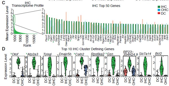 • 單細(xì)胞RNA-seq可鑒定內(nèi)毛細(xì)胞(inner?hair?cells,IHCs)和外毛細(xì)胞(outlier?hair?cells,OHCs)定義基因;