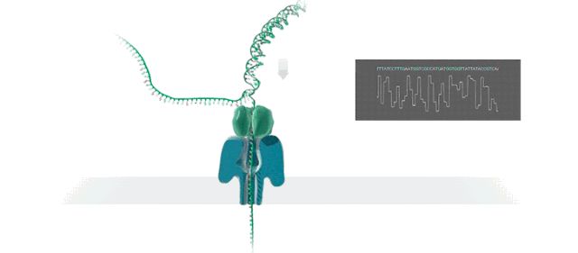 ONT測(cè)序?qū)⑷斯ず铣傻囊环N多聚合物的膜浸在離子溶液中,多聚合物膜上布滿了經(jīng)改造的穿膜孔的跨膜通道蛋白(納米孔),也就是Reader蛋白,在膜兩側(cè)施加不同的電壓產(chǎn)生電壓差,DNA鏈在馬達(dá)蛋白的牽引下,解螺旋通過(guò)納米孔蛋白,不同的堿基會(huì)形成特征性離子電流變化信號(hào),通過(guò)對(duì)這些信號(hào)的檢測(cè),得到堿基序列,完成測(cè)序。