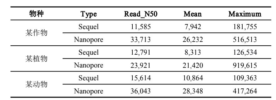 數(shù)據(jù)讀長(zhǎng)比較,后3列依次是Read_N50,平均長(zhǎng)度和最長(zhǎng)reads大小,單位都是bp哦。。。。