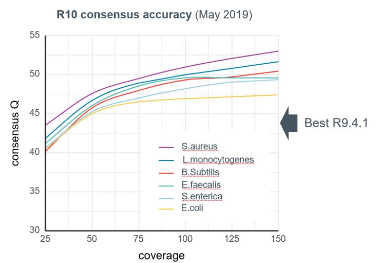 全新R10芯片在設(shè)計(jì)上采用了信號(hào)雙識(shí)別的策略,與R9.4.1芯片相比,有效提升原始序列,同聚物區(qū)域及Consensus序列準(zhǔn)確性。在不使用二代數(shù)據(jù)的情況下,結(jié)合R9.4.1及R10的數(shù)據(jù),可獲得更高的準(zhǔn)確性!目前R10芯片全球還處于小試研發(fā)階段,如果一切順利,三季度即可大規(guī)模商用,敬請(qǐng)期待!