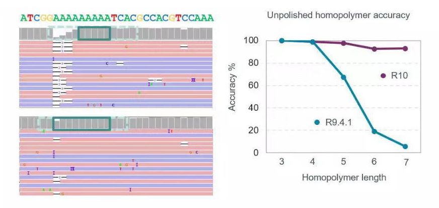 同聚物的識(shí)別準(zhǔn)確性是大家一直都比較關(guān)心的問題,從ONT官方釋放的測(cè)試結(jié)果顯示,相比于R9.4.1,R10版本芯片能夠顯著提高其在同聚物區(qū)域的堿基識(shí)別準(zhǔn)確度,并且?guī)缀醪粫?huì)引入缺失錯(cuò)誤(圖5)。