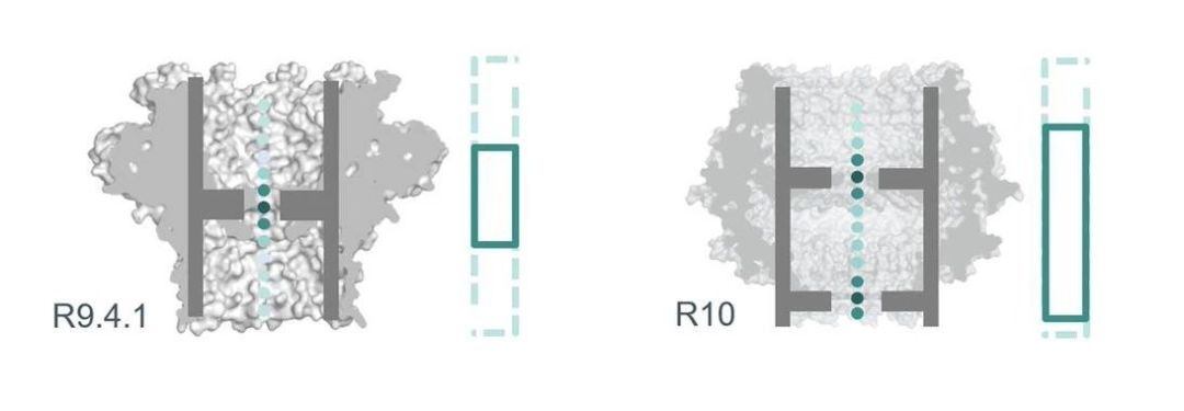 新升級(jí)R10芯片大的更新是納米孔采用了雙讀取器(Reader)的設(shè)計(jì),能夠?qū)ν粔A基進(jìn)行兩次信號(hào)識(shí)別。理論上,同一堿基的識(shí)別次數(shù)為R9.4.1版本芯片2倍,由此來增加堿基的判斷率,減小隨機(jī)錯(cuò)誤,并提高一致準(zhǔn)確性。R10與R9.4.1測(cè)序方式比較如圖1