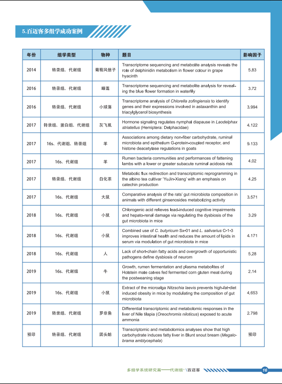 百邁客致力于將好的技術(shù)提供給科研者。代謝組服務(wù)現(xiàn)已細(xì)分服務(wù)內(nèi)容,涉及非靶向代謝組,脂質(zhì)非靶向代謝組,靶標(biāo)代謝組,植物高通量靶標(biāo),動物高通量靶標(biāo),花青素高通量靶標(biāo),游離脂肪酸高通量靶標(biāo),氨基酸高通量靶標(biāo)等。目前,百邁客已經(jīng)協(xié)助發(fā)表大量多組學(xué)聯(lián)合文章,涉及到轉(zhuǎn)錄組 & 代謝組、微生物多樣性 & 代謝組,轉(zhuǎn)錄組 & 微生物多樣性 & 代謝組。點(diǎn)擊這里下載“百邁客生物代謝組成功案例>>百邁客生物代謝組成功案例