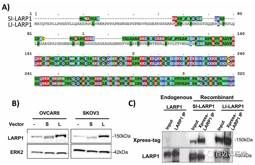 圖1A為NCBI基因數(shù)據(jù)庫中列出的9種不同的LARP1經(jīng)驗(yàn)證的isoform。LARP1典型轉(zhuǎn)錄本為NM_015315.5,編碼1019個氨基酸(NP_056130.2)的蛋白質(zhì),在此處稱為“ SI-LARP1”。UniProtKB數(shù)據(jù)庫引用了另一個比較長的轉(zhuǎn)錄本NM_033551.3作為LARP1的規(guī)范形式,它對應(yīng)于1096個氨基酸蛋白(NP_291029.2),在此稱為“LI-LARP1” 。SI-LARP1蛋白與LI-LARP1不同,它缺少前77個氨基酸,并且氨基酸M1至N67不同。