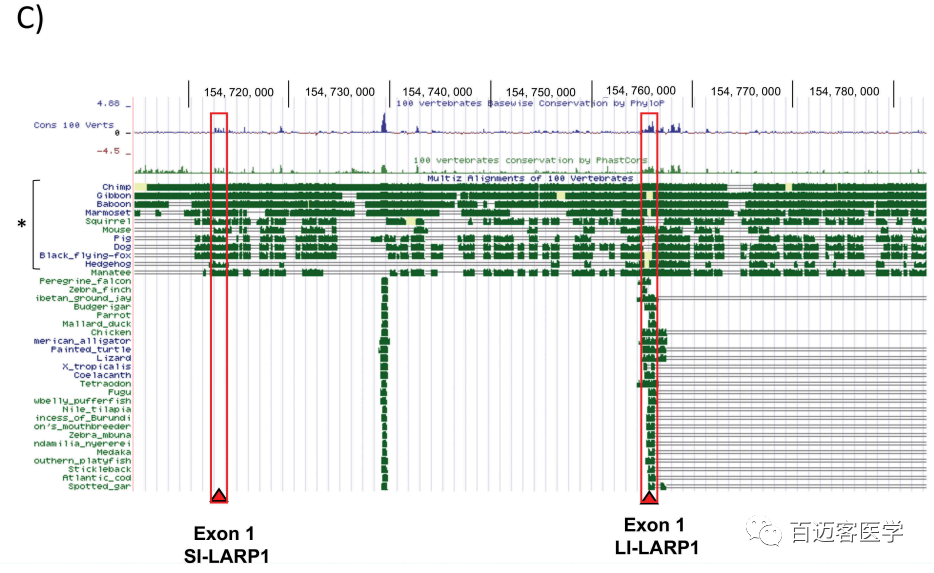 接下來,作者對SI-LARP1是否可以發(fā)揮獨(dú)特的功能作用感興趣。為此分析了2種LARP1亞型的TSS區(qū)保守水平(圖5C)。作者假設(shè),進(jìn)化保守將暗示選擇性壓力,因此每種亞型的作用不同。為了解釋LARP1亞型的進(jìn)化保守性,使用UCSC基因組瀏覽器在脊椎動物(鳥類、魚類、兩棲動物、爬行動物、哺乳動物)亞門上生成了100個可用LARP1序列的多序列比對。出乎意料的是,LI-LARP1外顯子1在整個亞科中都具有很強(qiáng)的保守性,但SI-LARP1外顯子1的保守性僅存在于胎盤動物分支中,其中包括人類和其他靈長類動物。這表明它可能在胎盤哺乳動物的進(jìn)化晚期獲得了功能性作用。相比之下,LI-LARP1的保守性跨多個進(jìn)化分支表明作用更為古老。