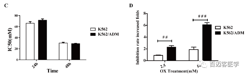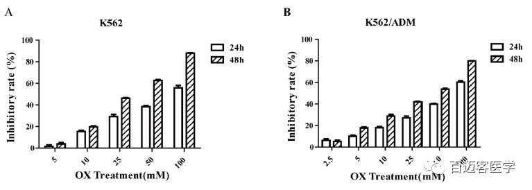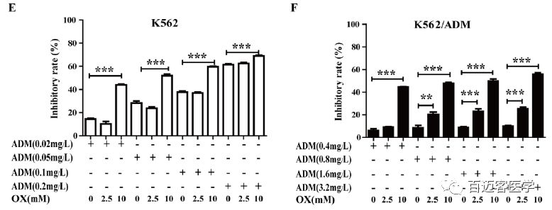 如圖,單獨用草酸處理的兩個細胞系均呈現(xiàn)時間和劑量依賴性細胞毒性,但是細胞毒性相對較低。相比于單獨用ADM處理,用ADM和草酸聯(lián)合處理后,K562細胞和K562/ADM細胞增殖抑制率分別提高了為2.28±0.56倍和6.08±0.77倍,K562/ADM細胞增殖抑制率的增加倍數(shù)明顯高于K562細胞。