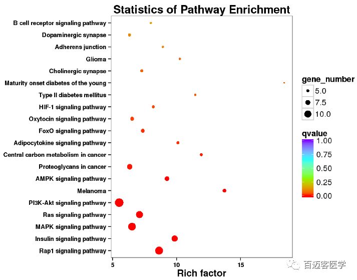 此外,KEGG聚類和富集分析顯示,與K562細胞相比,K562/ADM細胞中存在多個生物學過程的變化。為了進一步闡明糖代謝重編程的分子機制,將DEG比對到參與葡萄糖代謝的相關(guān)信號轉(zhuǎn)導途徑。所有DEG都是比對到了信號轉(zhuǎn)導途徑,如MAPK、PI3K-AKT、HIF、Ras等。如圖,PI3K-AKT通路是DEG富集最多的通路。PI3K-AKT通路通過調(diào)節(jié)代謝分子(包括LDHA、HK-II和GLUT)的表達或移位,作為代謝穩(wěn)態(tài)的關(guān)鍵調(diào)控因子。結(jié)果顯示,PI3K-AKT通路是K562/ADM細胞中最富集的上調(diào)通路,與糖代謝重編程和MDR的發(fā)展有關(guān)。