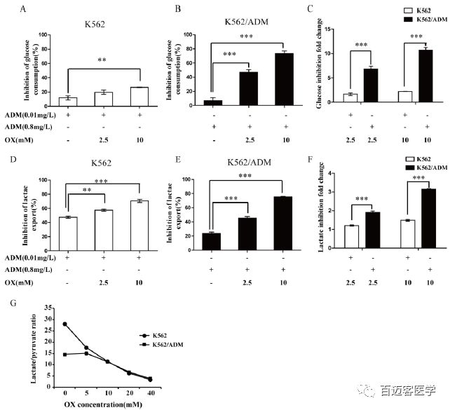 在上述試驗中,作者發(fā)現(xiàn)ADM聯(lián)合草酸處理增加了人白血病細胞的細胞毒性。然后,作者研究了草酸對ADM處理的K562和K562/ADM細胞系糖代謝作用的影響,發(fā)現(xiàn)相比于ADM單獨處理,ADM和草酸共同處理48h后,兩個細胞系的葡萄糖消耗和乳酸生成的抑制作用均有所增強。草酸導致兩種細胞系糖酵解抑制呈現(xiàn)劑量依賴性增加,而耐藥細胞糖酵解抑制的變化倍數(shù)更高,這與聯(lián)合處理時耐藥細胞療效升高倍數(shù)更高所一致,說明草酸對糖酵解的抑制導致葡萄糖消耗和乳酸生成的減少,導致白血病細胞對ADM的敏感性增加。