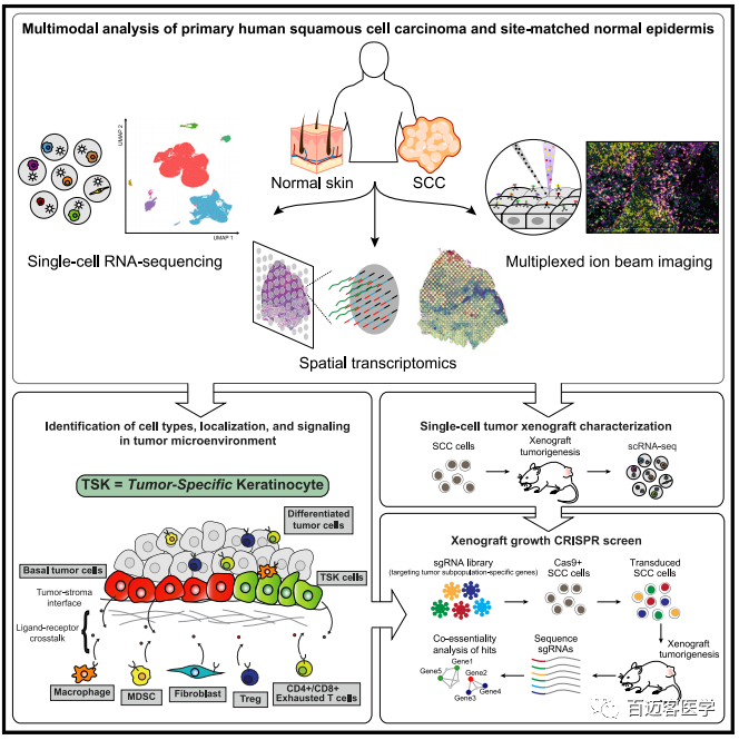 為了定義皮膚鱗狀細(xì)胞癌(cSCC)的細(xì)胞組成和結(jié)構(gòu),本研究結(jié)合單細(xì)胞轉(zhuǎn)錄組測序、空間轉(zhuǎn)錄組和多路復(fù)用離子束成像技術(shù),對一系列人皮膚鱗狀細(xì)胞癌和與之匹配的正常皮膚進(jìn)行分析。結(jié)果顯示cSCC存在四種腫瘤細(xì)胞亞群,三種與正常組織一致,第四種是癌癥所特有的腫瘤特異性角化細(xì)胞(TSK),并且定位于維管組織的生態(tài)位。整合單細(xì)胞測序和空間數(shù)據(jù)映射配體-受體網(wǎng)絡(luò)到特異的細(xì)胞類型,揭示了TSK細(xì)胞是細(xì)胞通訊的中心。本研究還發(fā)掘了多種潛在的免疫抑制特征,包括Treg與CD8細(xì)胞在分隔的腫瘤間質(zhì)中的共定位。最后,通過人癌細(xì)胞的異種移植單細(xì)胞特征和體內(nèi)CRISPR篩選確定了腫瘤形成中特殊腫瘤亞群富集基因網(wǎng)絡(luò)的重要作用。這些數(shù)據(jù)明確了cSCC和基質(zhì)細(xì)胞亞群互作的空間生態(tài)位以及參與癌癥的基因網(wǎng)絡(luò)。
