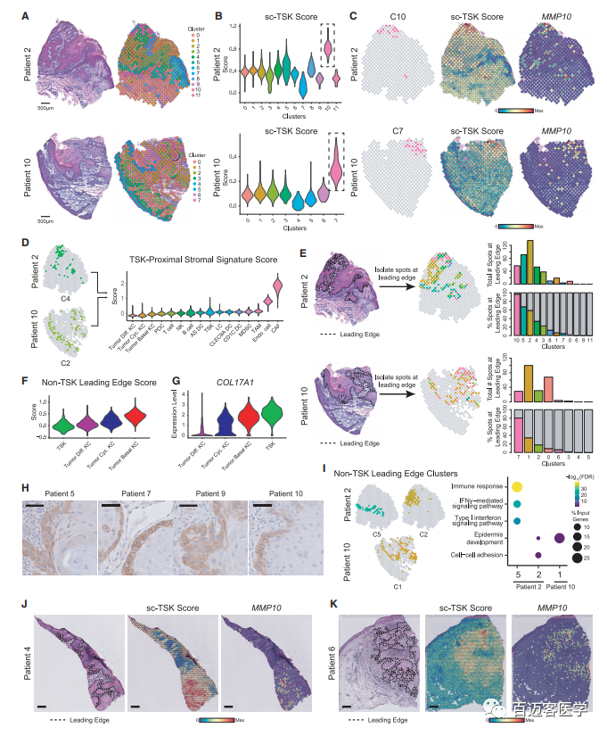 在患者中,腫瘤相關(guān)的斑點簇展現(xiàn)出單細(xì)胞測序腫瘤KCs的定位基因表達(dá),同時免疫或間質(zhì)基因與腫瘤臨近間質(zhì)、未受累的間質(zhì)或附件區(qū)域有關(guān)聯(lián),與大體的cSCC結(jié)構(gòu)一致(圖3A)。使用scRNA-seq中TSK標(biāo)記基因?qū)γ總€空間轉(zhuǎn)錄組斑點評分,顯著突出了一個TSK-high簇,包括TSK標(biāo)記物MMP10(圖3B&C)。在具有清晰前沿的腫瘤中,TSK鄰近間質(zhì)富集了癌癥相關(guān)成纖維細(xì)胞 (CAF)和內(nèi)皮細(xì)胞轉(zhuǎn)錄本,表明TSK細(xì)胞主要位于纖維血管微環(huán)境中(圖3D)。超過80%的TSK高簇點位于腫瘤前沿,其余的前沿點富集了Basal腫瘤基因(圖3E&F),這種共存關(guān)系通過共表達(dá)標(biāo)志物COL17A1的免疫組化得到進(jìn)一步確認(rèn)(圖3G&H)。此外,炎癥反應(yīng)和干擾素信號基因在非TSK前沿表達(dá),與干擾素相關(guān)轉(zhuǎn)錄本在腫瘤基底群體中的存在一致(圖2E&I)。這些結(jié)果確定了TSK、Basal細(xì)胞以及TSK近端纖維血管生態(tài)位造成的cSCC腫瘤前沿的異質(zhì)性。