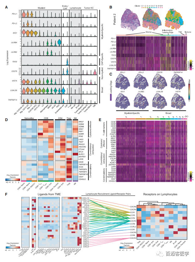 為了探究何種細(xì)胞類型影響了cSCC的免疫活動,我們調(diào)查了熟知的免疫抑制基因(圖4A),CD274(PD-L1)和PDCD1LG2(PD-L2)等基因在ST中表現(xiàn)出空間簇特異性模式,與特定細(xì)胞類型的共定位一致,骨髓特異性因子在炎癥前沿占據(jù)優(yōu)勢地位(圖4B&C)。衰竭的CD4和CD8 T細(xì)胞亞群除表達(dá)細(xì)胞毒性基因外,還表達(dá)抑制性受體和衰竭標(biāo)志物(圖4D)。在空間位置上,T細(xì)胞轉(zhuǎn)錄本出現(xiàn)在炎癥前沿和免疫相關(guān)細(xì)胞簇中(圖4E)。并且發(fā)現(xiàn)scRNA-seq中幾種趨化因子受體在重疊的T細(xì)胞亞群中高表達(dá)。Tregs特異性表達(dá)CCR8,這可能是一個潛在藥物靶點(圖4F)。綜上所述,這些結(jié)果強(qiáng)調(diào)了參與免疫抑制機(jī)制的多種細(xì)胞類型,包括誘導(dǎo)DC和衰竭T細(xì)胞共抑制信號,以及招募Tregs。