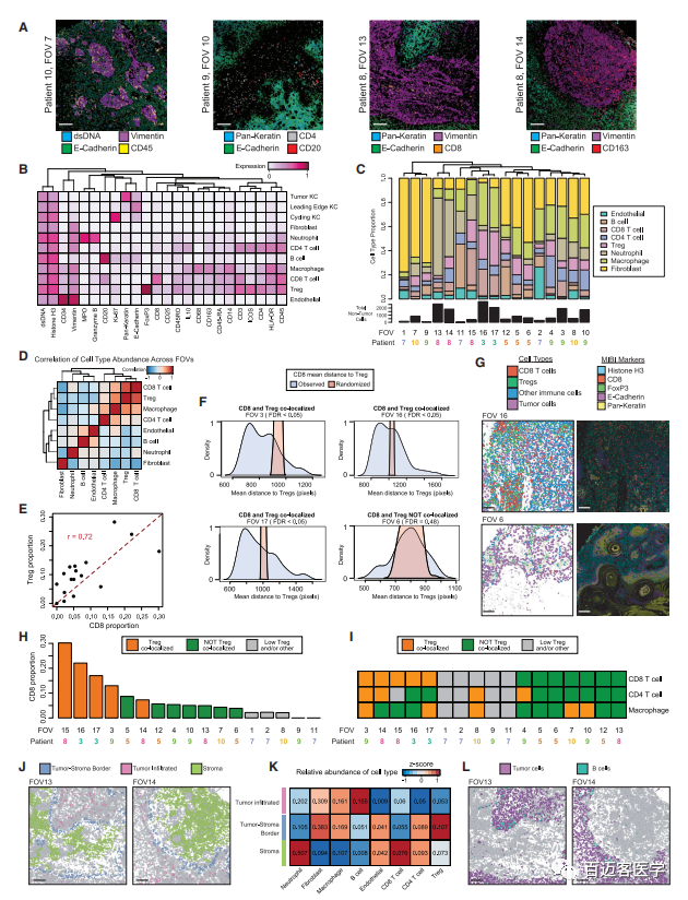 利用多重離子束成像(MIBI)技術(shù),在單細(xì)胞分辨率下解析TME的空間組織。我們對6例患者的腫瘤前緣進(jìn)行了18個視野的MIBI掃描,對38個腫瘤和基質(zhì)/免疫蛋白標(biāo)志物圖像進(jìn)行分段,確定了55832個細(xì)胞(圖5A),并且聚類分析的主要細(xì)胞類型與scRNA-seq細(xì)胞類型相似(圖5B)。間質(zhì)和免疫組分在腫瘤內(nèi)和腫瘤間是可變的,12/17的腫瘤患者圖像聚類不一致(圖5C)。腫瘤內(nèi)外的CD8 T細(xì)胞、Tregs、巨噬細(xì)胞和CD4 T細(xì)胞存在高度相關(guān)性,尤其前兩者更甚(圖5D)。5/12視野具備足夠的細(xì)胞進(jìn)行系統(tǒng)分析CD8 T細(xì)胞和Tregs距離(圖5F-H),我們發(fā)現(xiàn)了兩者的共定位,并且CD8 T細(xì)胞的比例也與共定位呈正相關(guān),表明Tregs受到TME的共招募和CD8 T細(xì)胞的共定位共同調(diào)節(jié),另外CD4 T細(xì)胞和巨噬細(xì)胞與Tregs共定位(圖5I)。成纖維細(xì)胞、巨噬細(xì)胞和Tregs在腫瘤-間質(zhì)邊緣最豐富,而CD8 T細(xì)胞和中性粒細(xì)胞被大量排除在腫瘤之外,表明 Treg 定位可能阻止效應(yīng)淋巴細(xì)胞進(jìn)入腫瘤(圖5J&K)。已經(jīng)被發(fā)現(xiàn)可以介導(dǎo)免疫抑制或抗腫瘤活性B細(xì)胞是唯一表現(xiàn)出優(yōu)先浸潤的細(xì)胞類型。