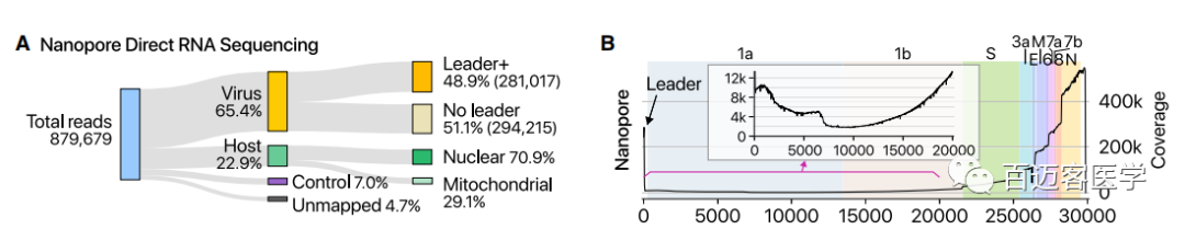 用MinION納米孔測序儀進行了DRS測序,獲得了879,679個reads(1.9 Gb)(圖1A)。大部分(65.4%)的reads定位于SARS-CoV-2,表明病毒轉(zhuǎn)錄本占據(jù)主導地位,而宿主基因的表達被嚴重抑制。已知DRS無法對末端12 nt進行測序,因此序列的5’末端缺失了12 nt(圖1B)。病毒基因組3’端的覆蓋度明顯高于5’端,這也反映了RNA直接測序從RNA3’端開始測序的特點。病毒RNA中前導序列(72nt)的普遍存在導致在5’末端出現(xiàn)一個顯著的峰。在sgRNA的leader-body junction位點檢測到覆蓋度的明顯下降。此外,觀察到反映出非常規(guī)的“拼接”事件的reads,這樣的融合轉(zhuǎn)錄本導致5’末端覆蓋度的增加(圖1B,插圖)。