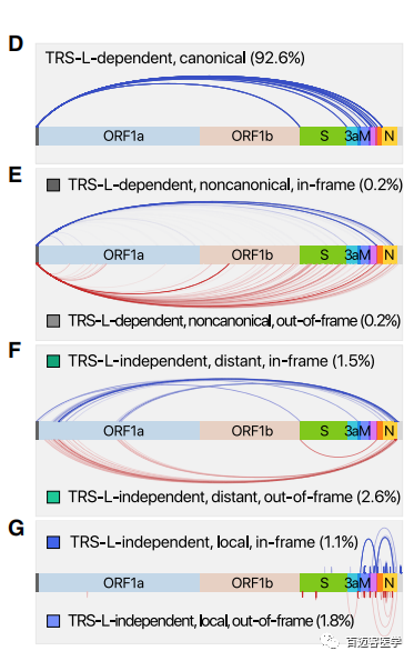 SARS-CoV-2除了具有預期結(jié)構(gòu)和長度的經(jīng)典sgRNA(圖4D),結(jié)果還顯示出許多次要的junction sites(圖4E–4G)。這種融合事件有三種主要類型。第一組中的RNA在位于ORF或UTR中間非預期的3’位點,前導序列(leader)與下游編碼序列(body)結(jié)合(圖4E,TRS-L-dependent noncanonical)。第二組顯示了與前導序列沒有相似性的序列之間的遠距離融合(圖4F, TRS-L-independent distant)。最后一組局部融合,這導致較小的缺失,主要發(fā)生在結(jié)構(gòu)基因和輔助基因中,包括S ORF(圖4G,TRS-L-independent local recombination)。