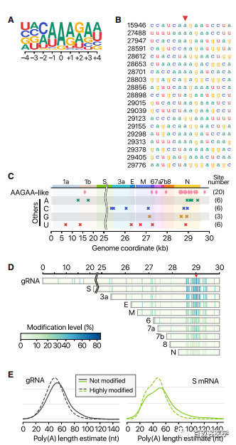在41個潛在的修飾位點中,最常見的motif是AAGAA(圖7A和7B)。在整個病毒基因組中都發(fā)現(xiàn)了“AAGAA-like”motif的修飾位點(包括AAGAA和其他富含A/G的序列),尤其是在基因組28,500-29,500處特別豐富(圖7C)。病毒長的轉(zhuǎn)錄本(gRNA,S,3a,E和M)比短RNA(6、7a,7b,8和N)的修飾頻率更高(圖7D),表明該修飾是特定于某些RNA種類。因為DRS可以同時檢測單個分子上的多個特征,所以作者交叉檢測了poly(A)尾長和內(nèi)部修飾位點。有趣的是,修飾的RNA分子的poly(A)尾比未修飾的短(圖7E)。這些結(jié)果表明內(nèi)部修飾和3’尾之間存在聯(lián)系。由于poly(A)尾巴在RNA周轉(zhuǎn)中起重要作用,因此很容易推測所觀察到的內(nèi)部修飾與病毒RNA穩(wěn)定性控制有關(guān)。