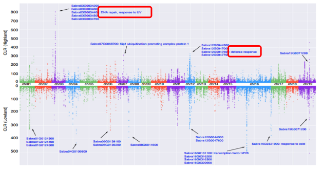 研究結(jié)果2:自然選擇在小墊柳高、低海拔群體中的作用區(qū)域和強(qiáng)度都具有顯著的差異,說明分布于橫斷山區(qū)海拔高差大、生境多樣而異質(zhì)的物種可能在自然選擇的作用下發(fā)生種下的種群分化(Sabra3G0034400DNA修復(fù),Sabra12G0047600細(xì)菌防御應(yīng)答,Sabra16G0101100細(xì)胞對DNA損傷刺激的應(yīng)答和對寒冷的應(yīng)答)。
