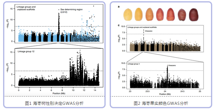 研究結(jié)果:海棗性別決定區(qū)域映射到 12 號連鎖群的遠(yuǎn)端,而這與之前的研究結(jié)果一致;21 個果實性狀大多數(shù)性狀沒有顯著關(guān)聯(lián);海棗果實顏色GWAS研究證實了之前的候選基因(4號連鎖群上~20 kb區(qū)域),表明油棕 VIR同源基因在海棗中控制紅/黃果實顏色多態(tài)性海棗糖分含量,定位到~1.1 Mb區(qū)域內(nèi)。