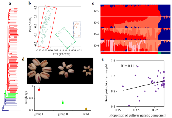 研究結(jié)果1:揭示了開心果的兩步馴化過程(栽培種質(zhì)分為兩個群。栽培種Group I的LD值最高,栽培種Group II和野生開心果的LD衰減值相近。Group II包括 Qazvini,Italiaei和Badami Zarand在內(nèi)的5種類型的個體,且這些種質(zhì)被記錄為古代具有種子的材料);