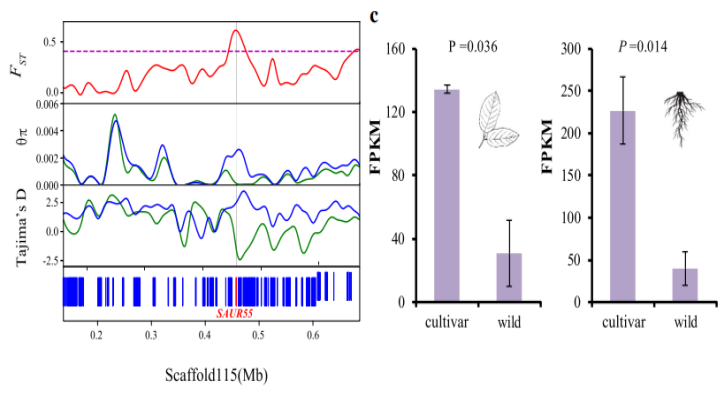 研究結(jié)果2:在開心果中,基因組上約有 9.2 Mb 的區(qū)域被鑒定為具有高水平的群體分化,包含665個基因,其中開心果株型可能與 SAUR55 基因的選擇相關(guān),同時該基因 表現(xiàn)出了顯著增加的表達(dá)水平;果實重量的變化發(fā)生在馴化與人工選擇期間(CYCD7-1基因)。