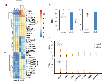 研究結(jié)果:轉(zhuǎn)錄組研究分析發(fā)現(xiàn)編碼幾丁質(zhì)酶的基因和參與 JA 生物合成途徑的基因可能有助于開心果適應(yīng)鹽水環(huán)境。